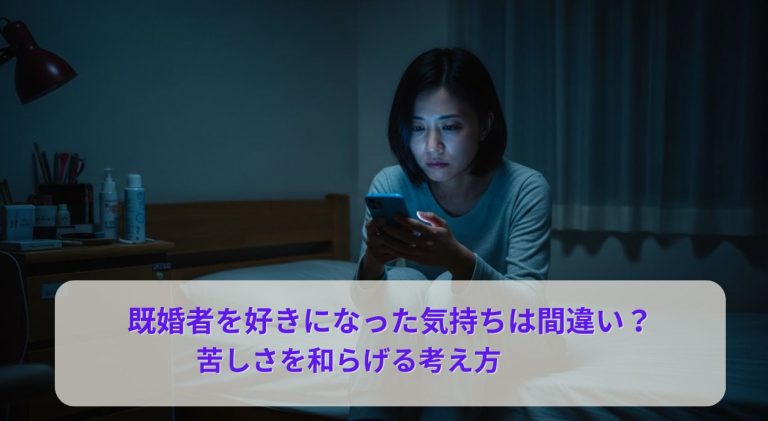 「ダメだとわかっているのに、気持ちが止まらない」 「奪いたいわけじゃない。ただ、苦しいだけ」 既婚者を好きになってしまったとき、多くの女性は「誰にも言えない孤独」と「自分を責める気持ち」の間で激しく揺れ動きます。 暗い部 … 続きを読む 既婚者を好きになった気持ちは間違い?苦しさを和らげる考え方