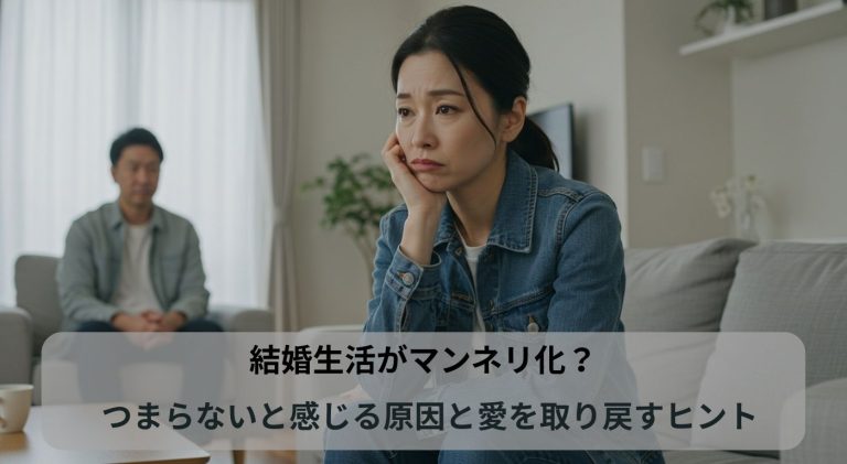 結婚生活に“つまらなさ”を感じていませんか? パートナーとの関係が「なんとなく味気ない」「刺激がない」と感じ始めたら、それは結婚生活がマンネリ化しているサインかもしれません。ある調査によると、既婚者の約4割が夫婦関係にマ … 続きを読む 結婚生活がマンネリ化?つまらないと感じる原因と愛を取り戻すヒント