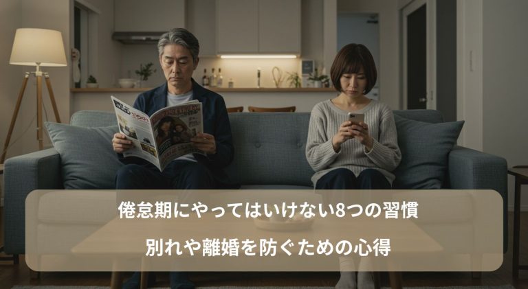 カップルでも夫婦でも、長く一緒にいれば必ず訪れると言われる“倦怠期”。その時期をどう乗り越えるかで、関係の未来は大きく変わります。今回は、倦怠期を迎えたときに無意識にやってしまいがちな「やってはい … 続きを読む 倦怠期にやってはいけない8つの習慣|別れや離婚を防ぐための心得