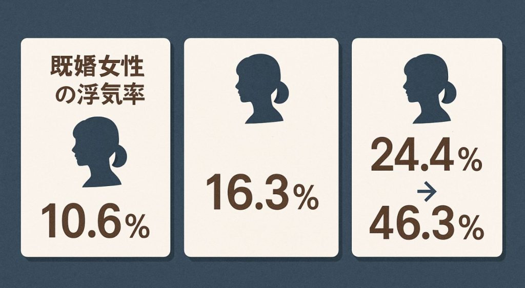 - さらに、別の調査では、2017年から2020年にかけて女性の浮気・不倫経験率が 24.4% から 46.3% へと急増した、という結果も報告されています。(参照:JFPA)