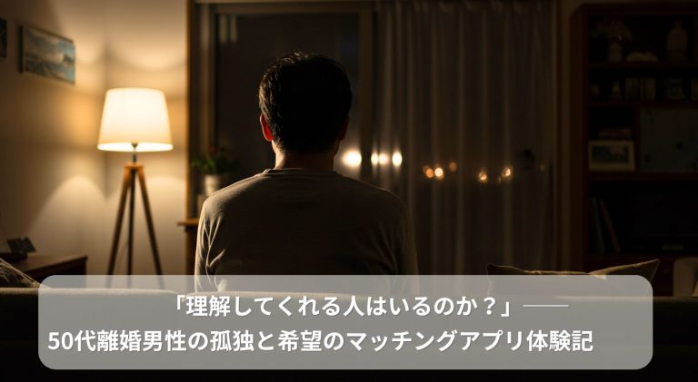 離婚して初めて、部屋がこんなにも静かだったのかと気づきました。52歳になった今、「理解してくれる人はいるのか?」という問いが、心の奥で静かに響いています。 この記事では、そんな私が既婚者・離婚経験者向けのマッチングアプリ … 続きを読む 「理解してくれる人はいるのか?」──50代離婚男性の孤独と希望のマッチングアプリ体験記